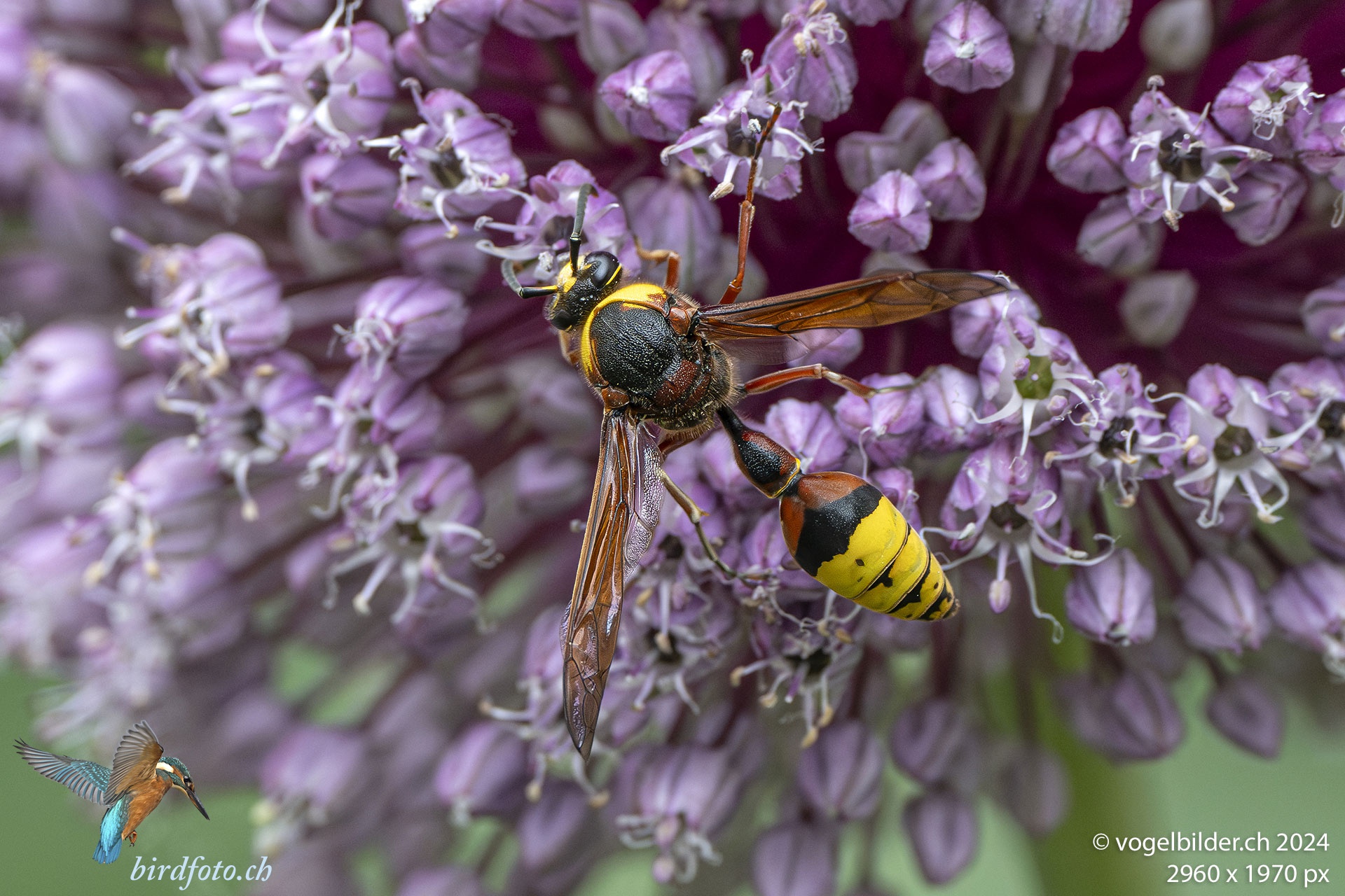 Grosse Lehmwespe, Delta unguiculatum, Weibchen, auf der Blüte des Zierknoblauchs inmitten der Stadt Zürich