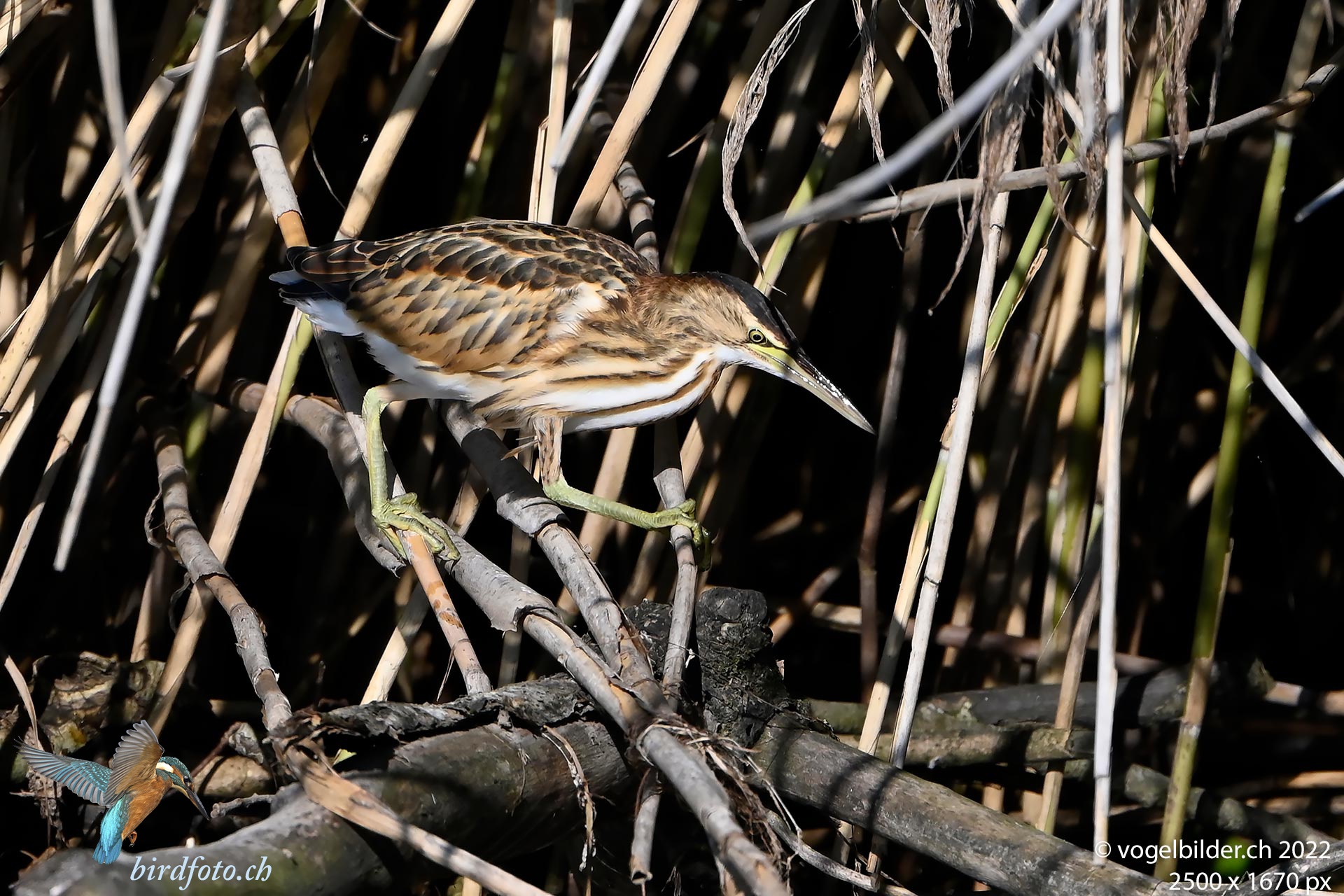 eine diesjährige Zwergdommel sucht auf sich allein gestellt nach nahrung am Schilfrand
