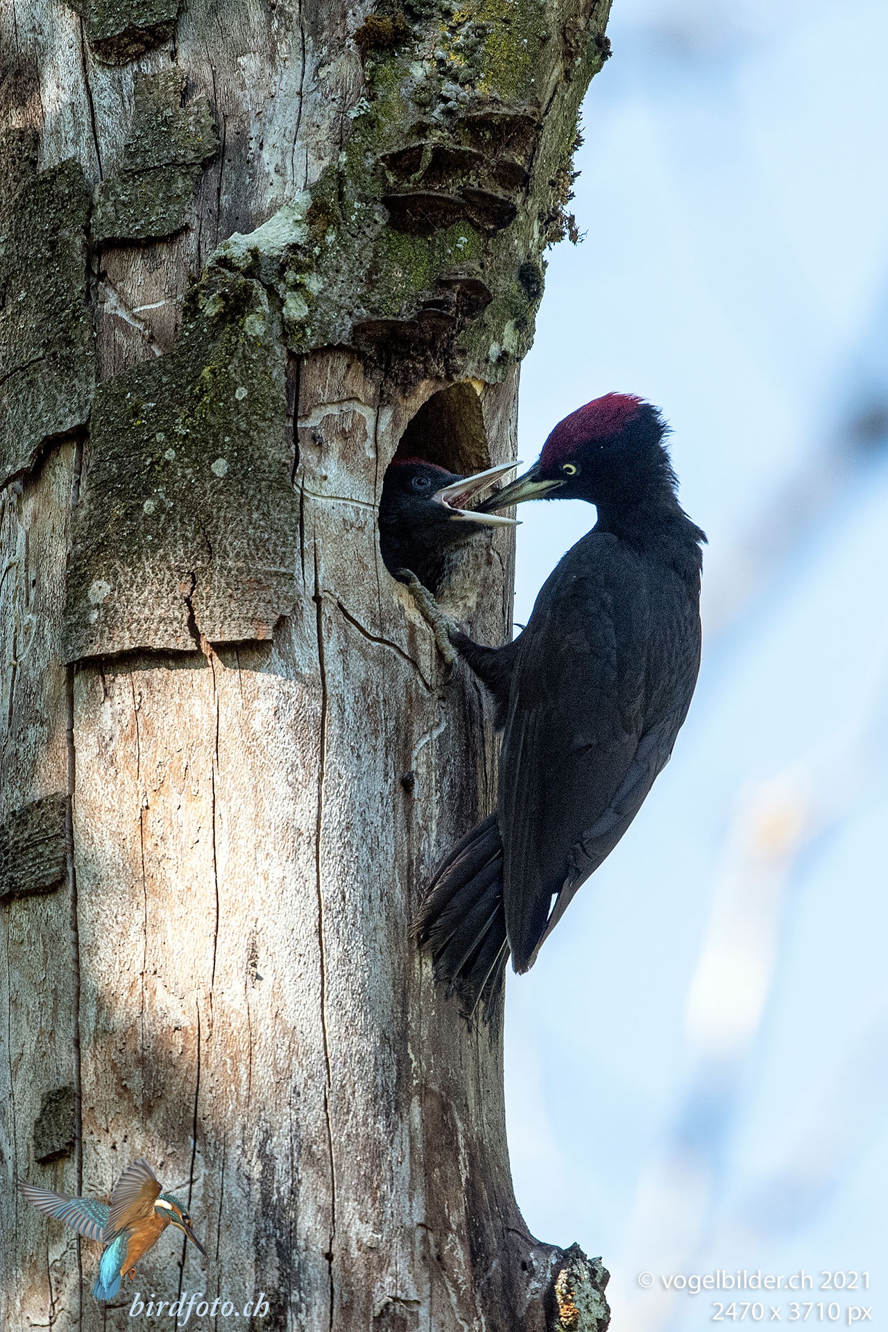Schwarzspechte sammeln die Nahrung im Kropf, weshalb sie nur etwa jede halbe Stunde vorbei kommen und den Jungen Futter bringen. Männchen und Weibchen füttern.