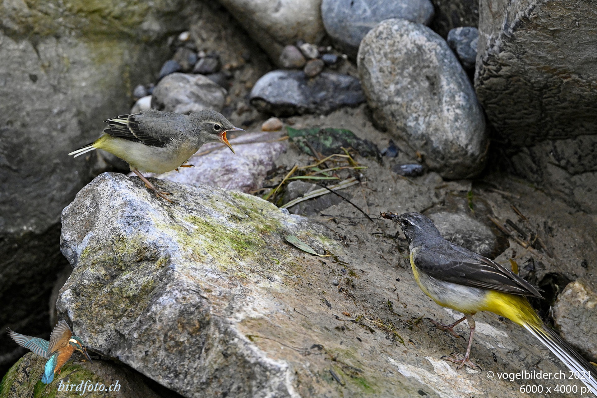 Die junge Gebirgstelze ist schon voll flugfähig, lässt sich aber gerne vom Altvogel verwöhnen.