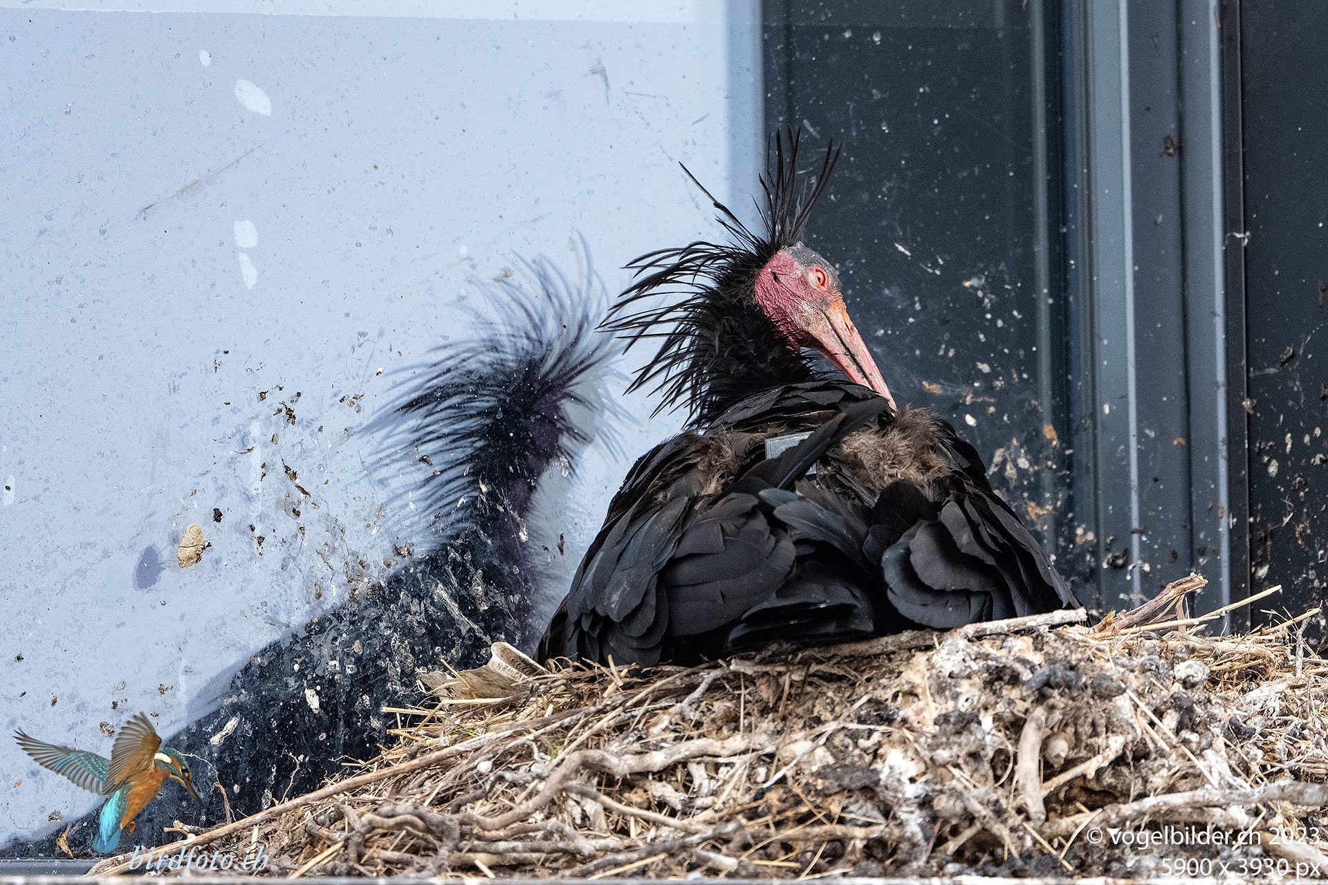 Direkt unter der Abflugschneise in Rümlang, auf einem Fenstersims der Harley-Davidson-Garage brüten dieses Jahr (2023) zwei Waldrappe