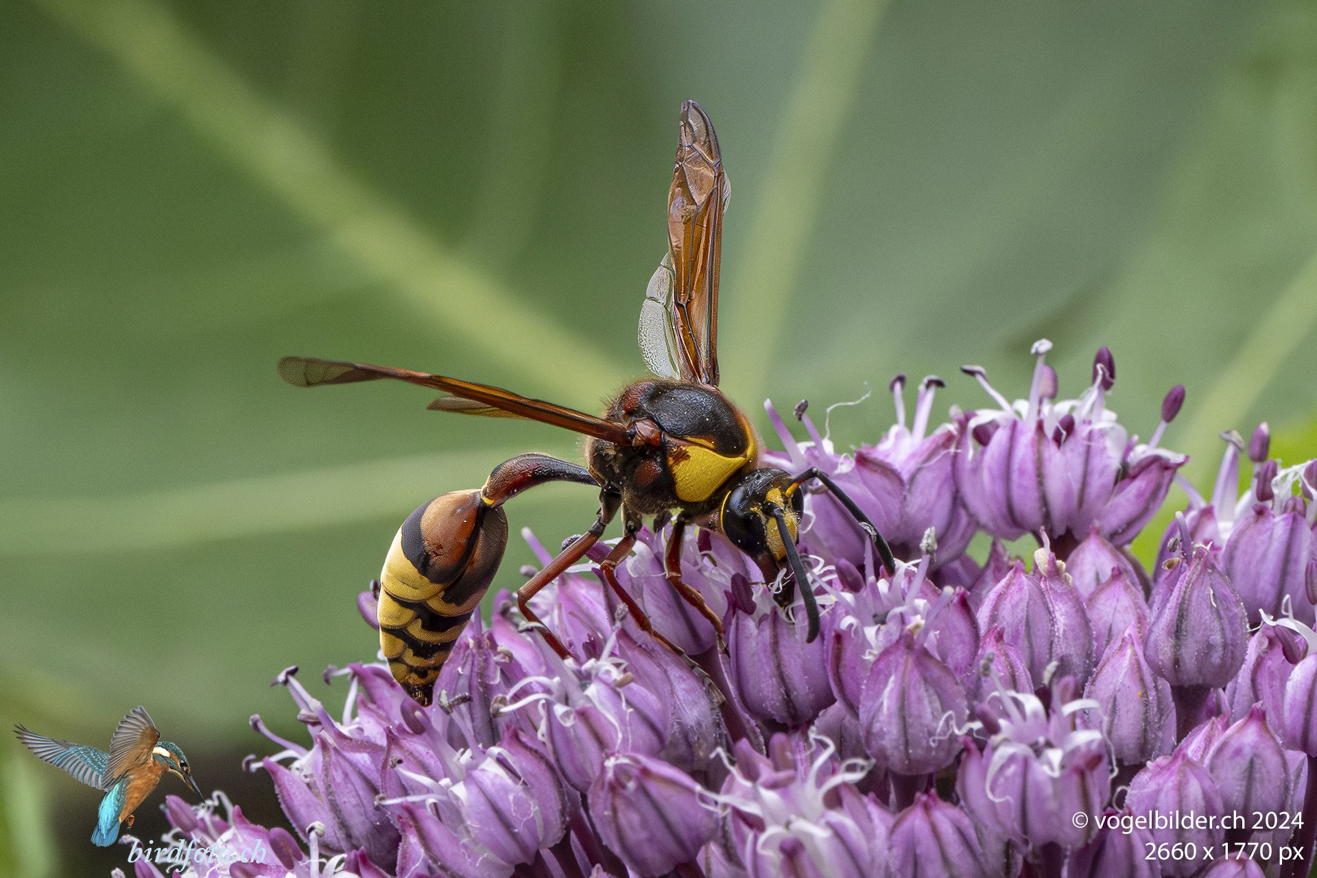 Grosse Lehmwespe, Delta unguiculatum, Weibchen, auf der Blüte des Zierknoblauchs inmitten der Stadt Zürich