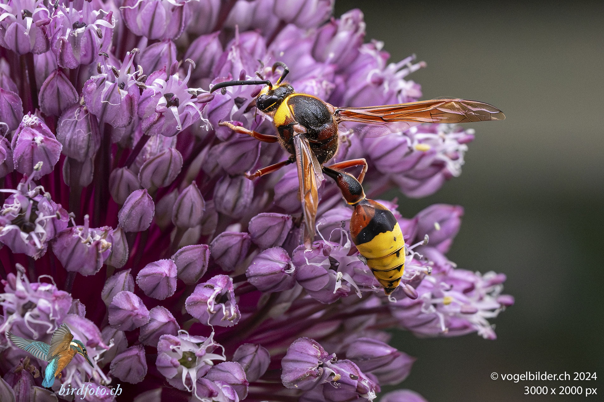 Grosse Lehmwespe, Delta unguiculatum, Weibchen, auf der Blüte des Zierknoblauchs inmitten der Stadt Zürich