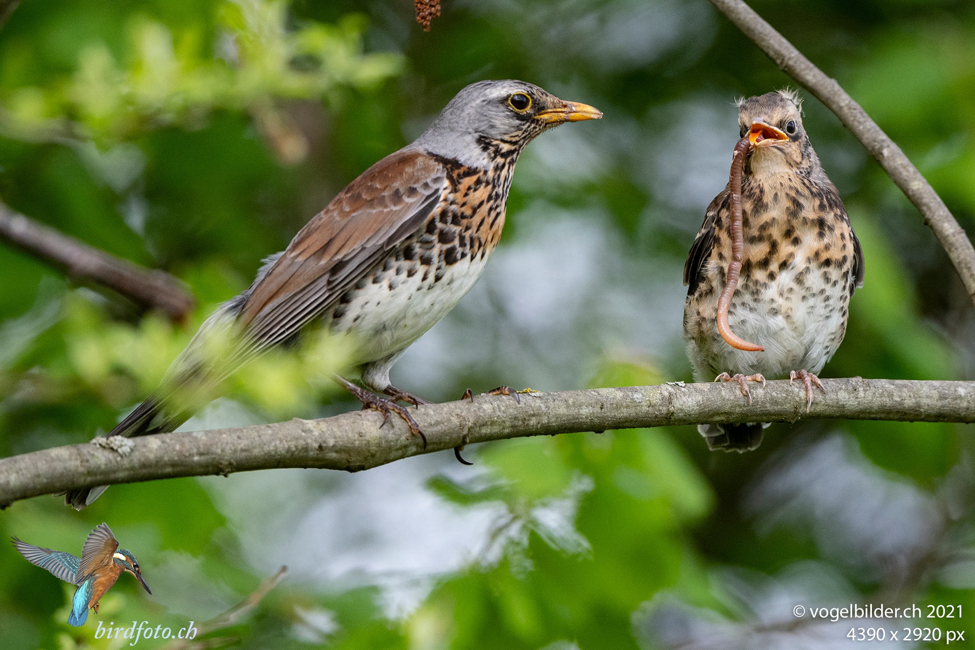 Mitte Mai ist es laut bei den Wacholderdrosseln, die Jungen haben das Nest verlassen und benötigen noch eine grosse Menge Futter.