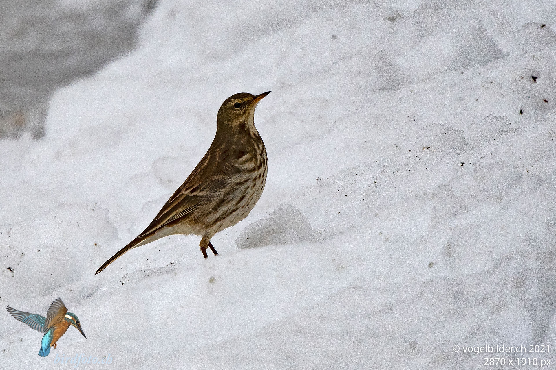 Entlang der Limmat suchen die Bergpieper mit Vorliebe auf dem Schnee nach Nahrung. Sie sind sehr scheu.