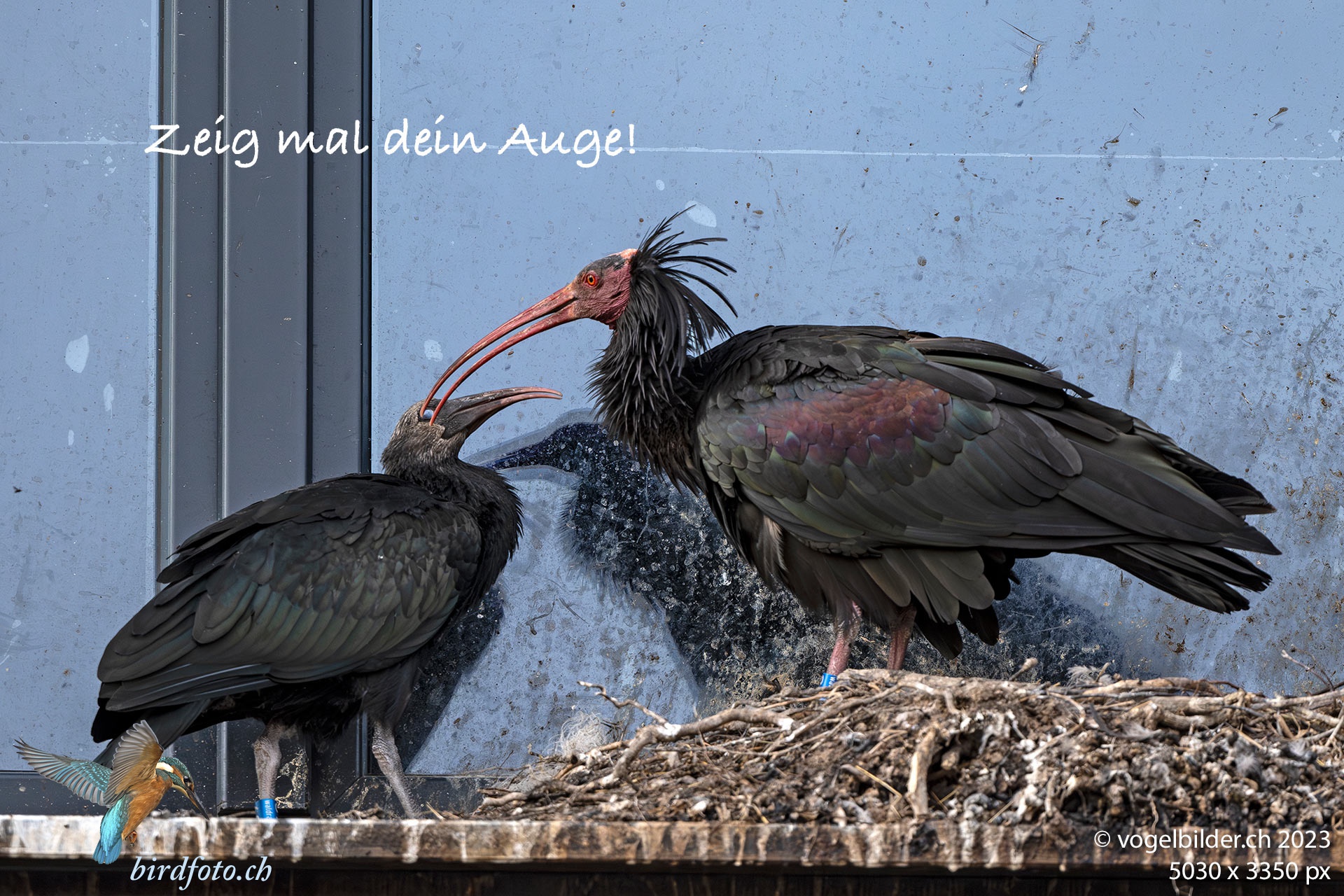 Waldrapp230723082450Die beiden Jungen sind beinahe voll befiedert und zeigen auch Ansätze der typischen Kopffrisur
